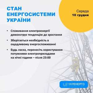 - Укренерго: Стан енергосистеми станом на 10 грудня